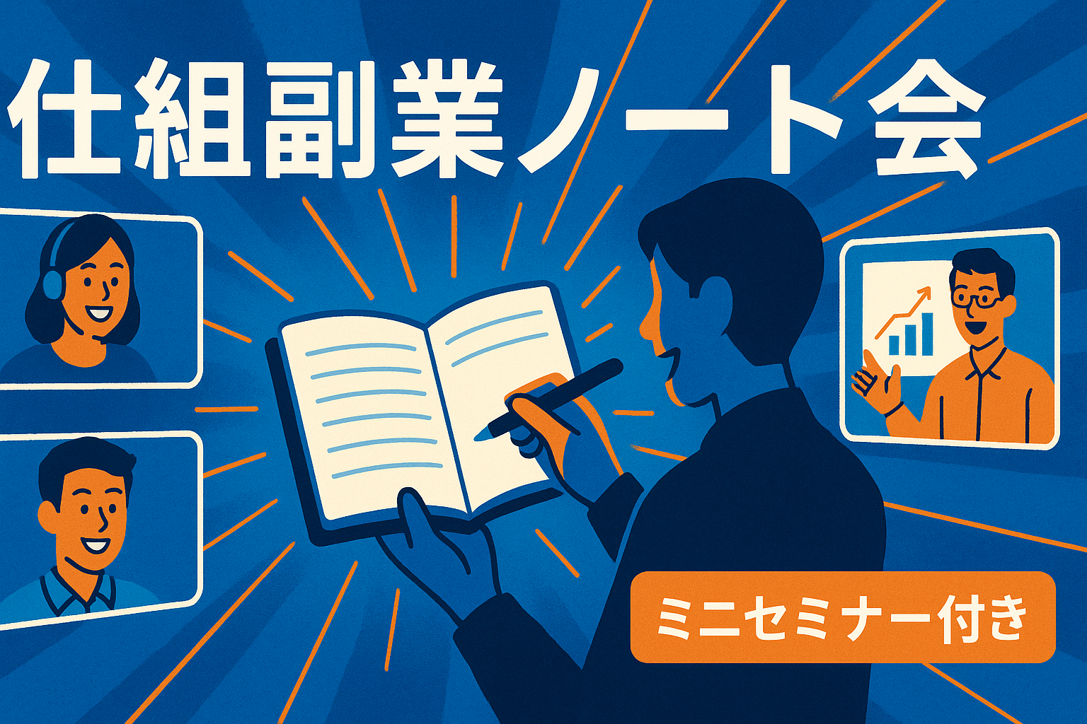「仕組み副業ノート会」は、あなたの副業目標と行動計画を“書く&話す”ことで整理し、仲間と共有して成長スピードを加速させるオンラインイベントです。ミニセミナー付き。