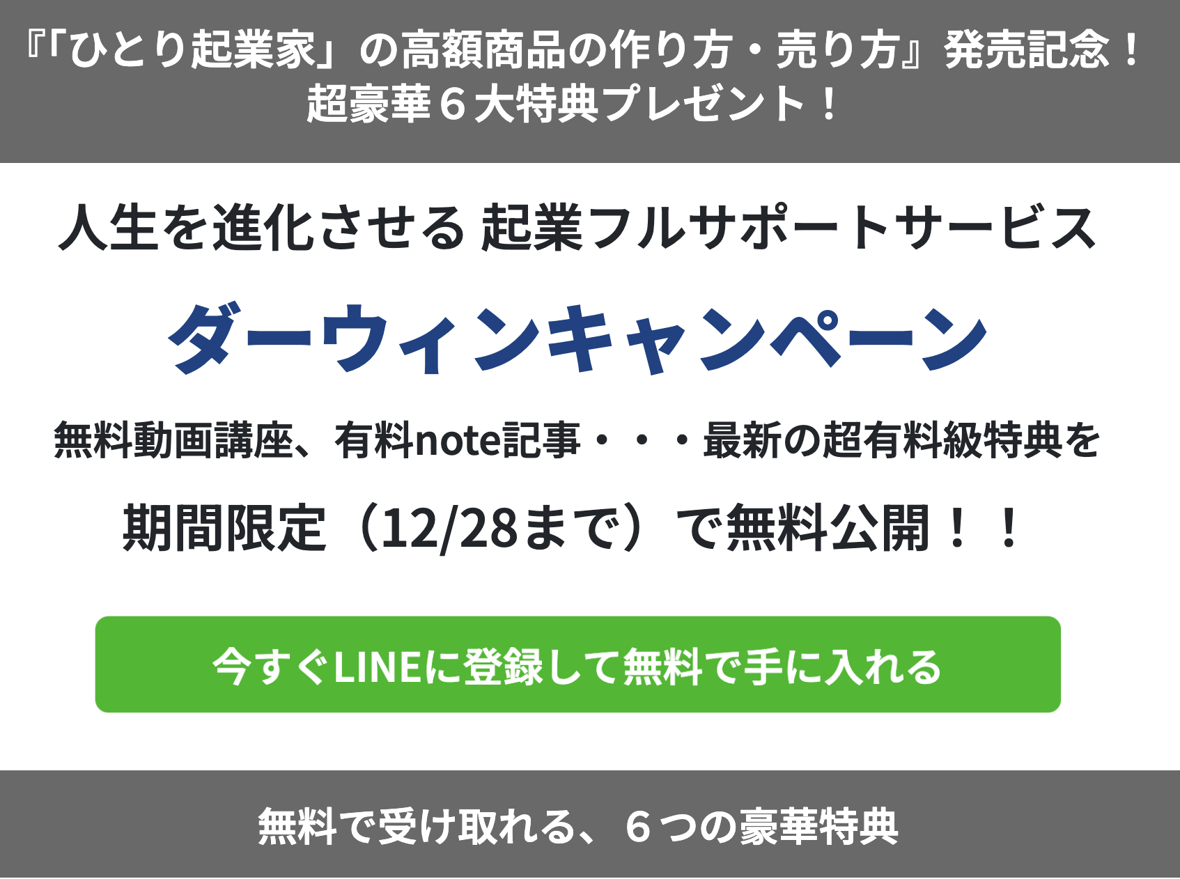 今はまさにキャンペーンの真っ最中で、著書『「ひとり起業家」の高額商品の作り方・売り方』の出版を記念して、発売翌日の12/12からスタートし、12/28(日)まで。豪華6大特典もあとは動画講座④を残すのみ。来週月曜日(12/22)には全て出揃います。こちらからエントリーして、全てを受け取って下さい。