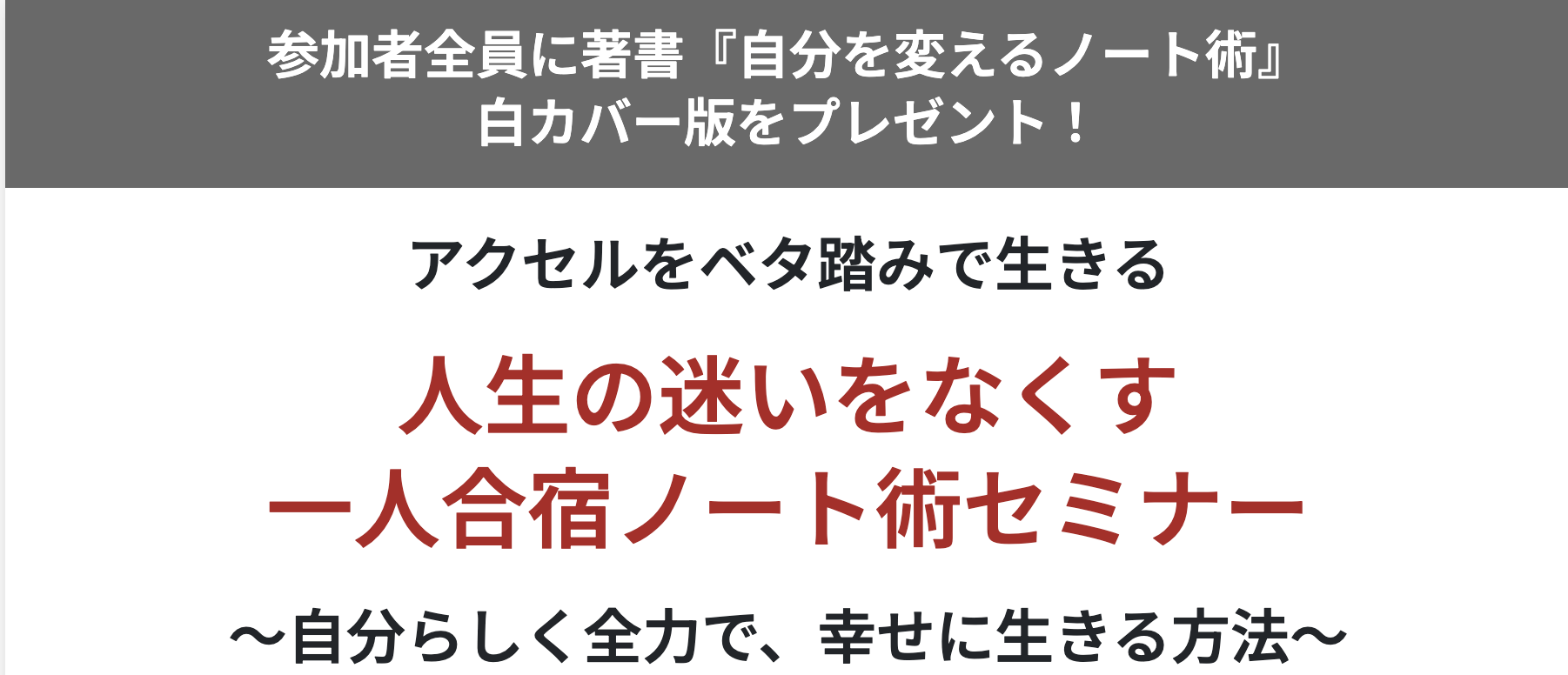 あと、今はセミナーもやってます。『人生の迷いをなくす一人合宿ノート術セミナー 〜自分らしく全力で、幸せに生きる方法〜』ってやつ。「安田さんの『自分を変えるノート術』を読んでファンになりました!」という人がおそらく一番多いので、それなのにこのセミナーに参加してくれないのはもはや意味不明です。なんなの。